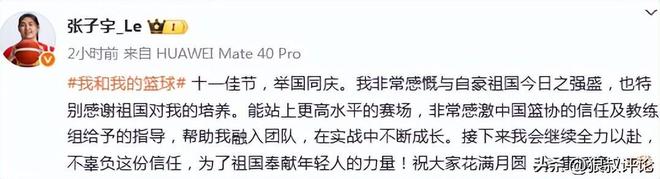 张子宇发文:十一佳节,举国同庆。我非常感慨与自豪祖国今日之强盛,也特别感谢祖国对我的培养。能站上更高水平的赛场,非常感激中国篮协的信任及教练组给予的指导,帮助我融入团队,在实战中不断成长。接下来我会继续全力以赴,不辜负这份信任,为了祖国奉献年轻人的力量!祝大家花满月圆,诸事顺意。