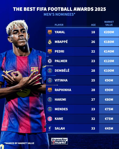 FIFA最佳球员候选身价:亚马尔2亿领跑 萨拉赫凯恩垫底